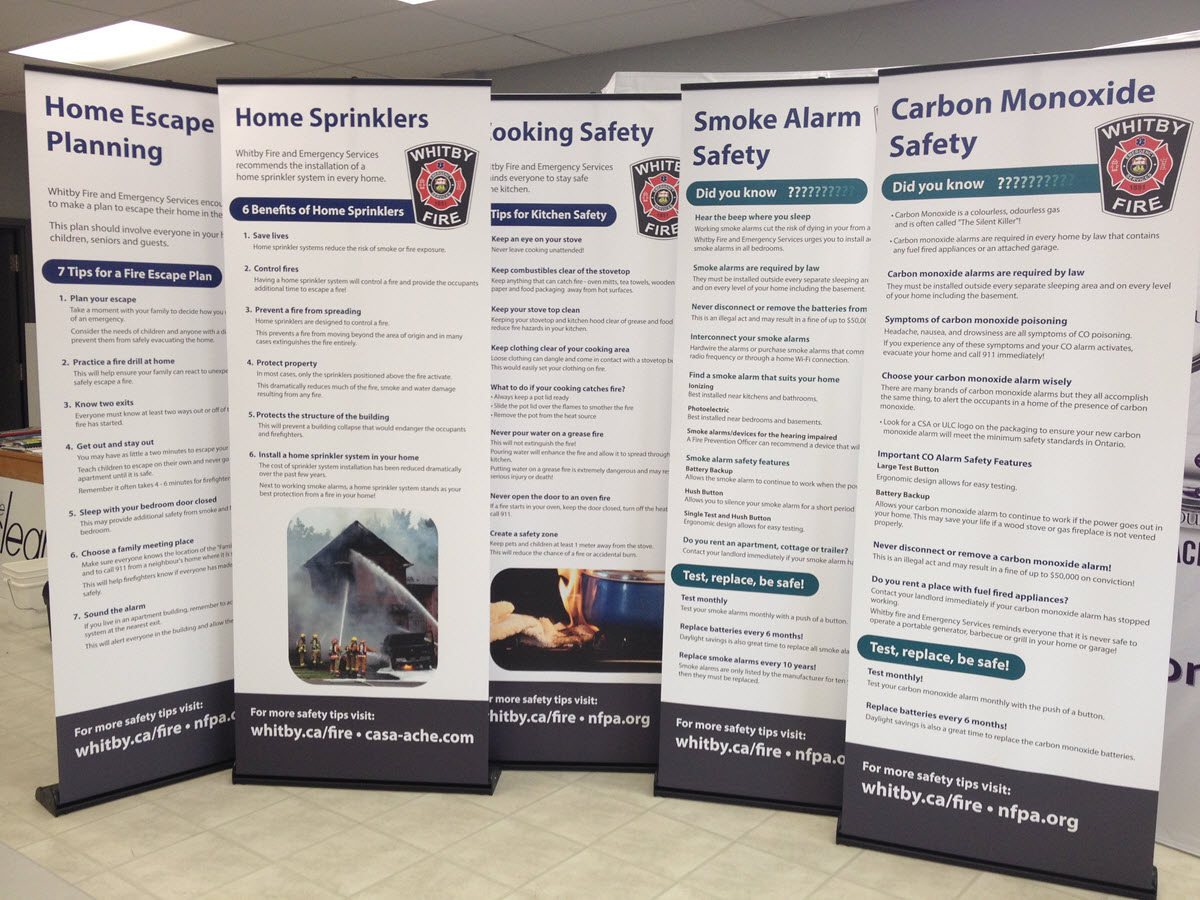 The first example comes from Speedpro Imaging Oshawa/Durham is a amazing set of retractable banners completed for the Whitby Fire Department. These brand new digital prints are on Decolit banner media installed into new retractable banner stands. Speedpro completed 5 that will be displayed at each fire station throughout Whitby, displaying a different message on each one!