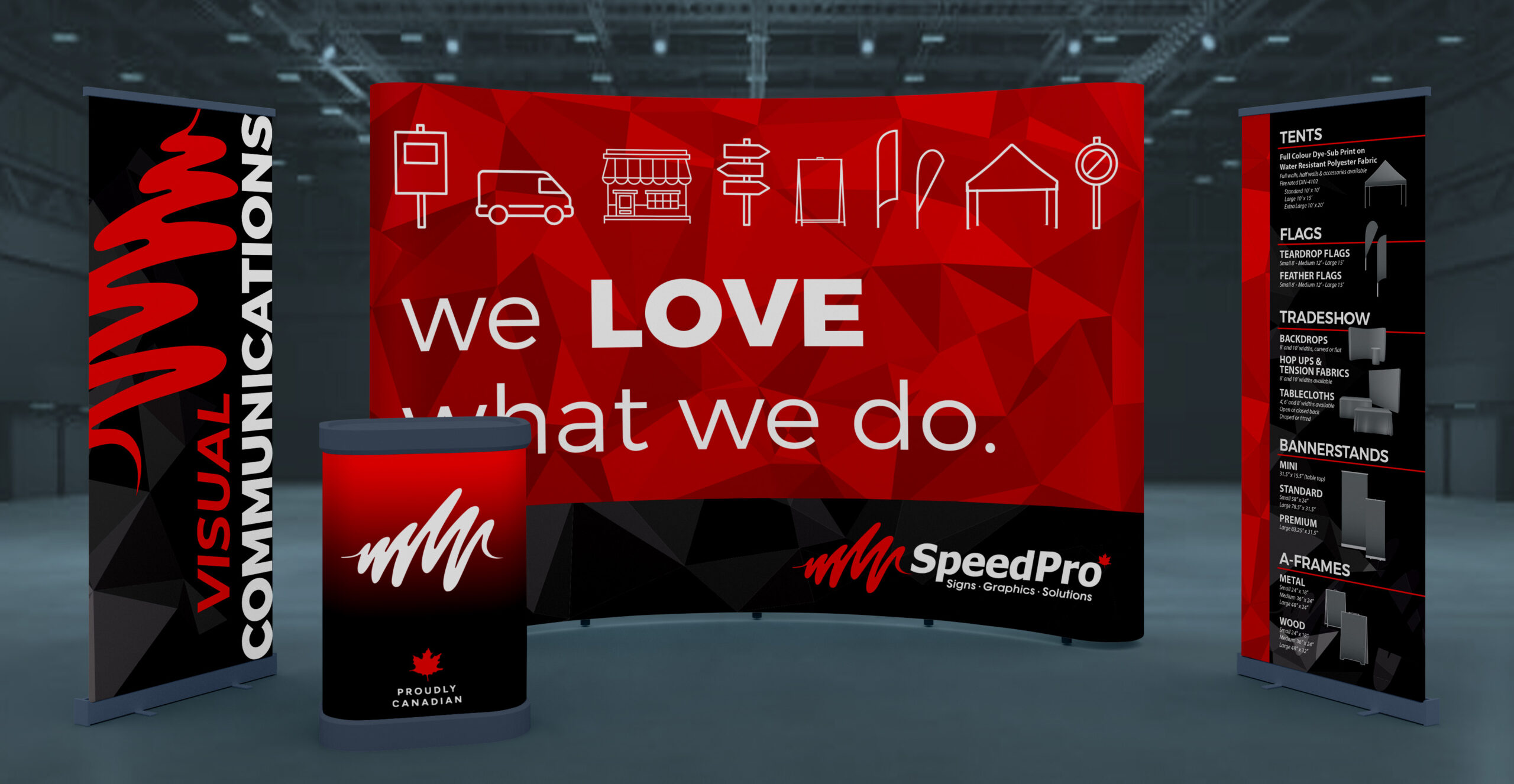 Speedpro offers in-house custom design and will produce a backdrop that will make potential clients stop even if they hadn’t planned.